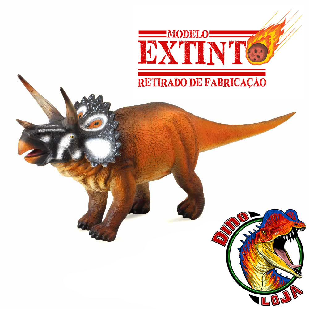 Sobre a espécie: Triceratops quer dizer Rosto com Três Chifres, um nome mais que adequado para este dinossauro ceratopsídeo, um dos mais conhecidos do mundo. O Triceratops viveu no período Cretáceo, era um dinossauro grande, praticamente 9 metros de comprimento com chifres de 1 metro e um crânio gigante de quase 3 metros. Seu corpo era robusto e preparado para defesa contra predadores e para lutar com rivais usando seus chifres. Especula-se que os machos da espécie teriam cores vibrantes no escudo do pescoço para atrair fêmeas ou que competiam em lutas com outros machos por território e direito de acasalar. Seus chifres eram afiados e podiam facilmente perfurar um Tiranossauro que tentasse atacá-lo. O Triceratops é verdadeiramente o Rinoceronte dentre os dinossauros, forte, ameaçador e possivelmente territorial, quando corria apontando sua cabeça para um alvo, certamente deveria causar um estrago.