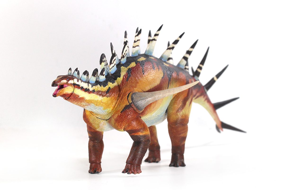 Sobre a espécie: O Kentrosaurus é um dinossauro herbívoro pertencendo ao grupo do estegossaurídeos, portanto é parente do Stegosaurus. Porém diferente de seu primo americano, o Kentrossauro era menor, com cerca de 4,5 metros e viveu na África e tinha placas diferentes, mais estreitas e que no meio das costas eram substituítas por espinhos longos e pontiagudos para bloquear o ataque de dinossauros predadores. O nome científico desse dinossauro africano é Kentrosaurus aethiopicus, que quer dizer "Lagarto de Pontas Afiadas da Etiópia", o que é meio estranho, pois seus primeiros fósseis foram na verdade achados na Tanzânia!