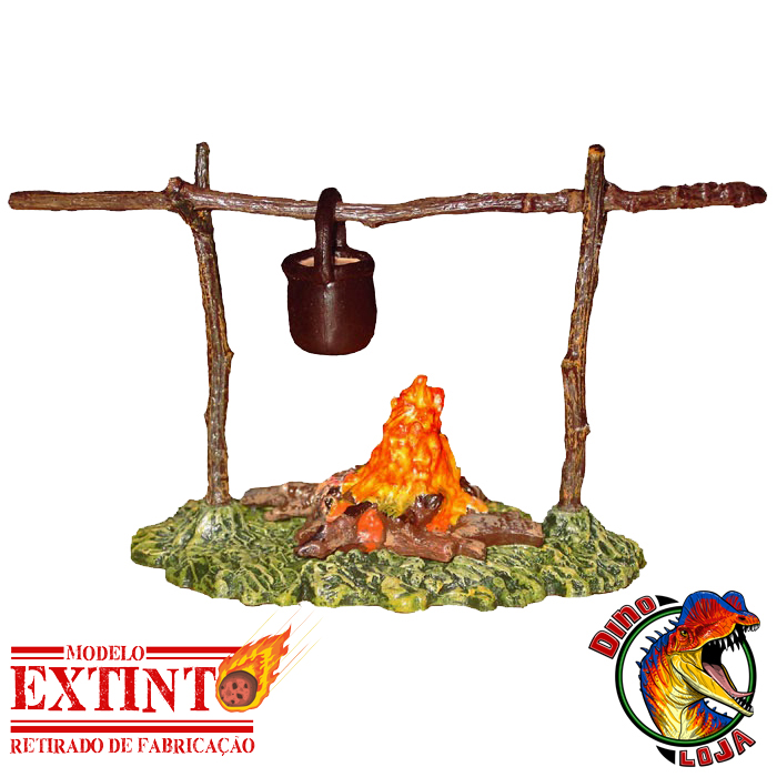 Sobre a miniatura: O modelo de acampamento "pré-histórico" da Papo na verdade é uma representação de uma fogueira de acampamento com uma armação em cima para assar comida e cozinhar com uma panela que acompanha a fogueira. Lançado pela marca em 2004 para servir tanto para uso com os homens da caverna da marca bem como a coleção de velho oeste da Papo. A vareta horizontal de cima da fogueira é destacável e permite remover a panela.