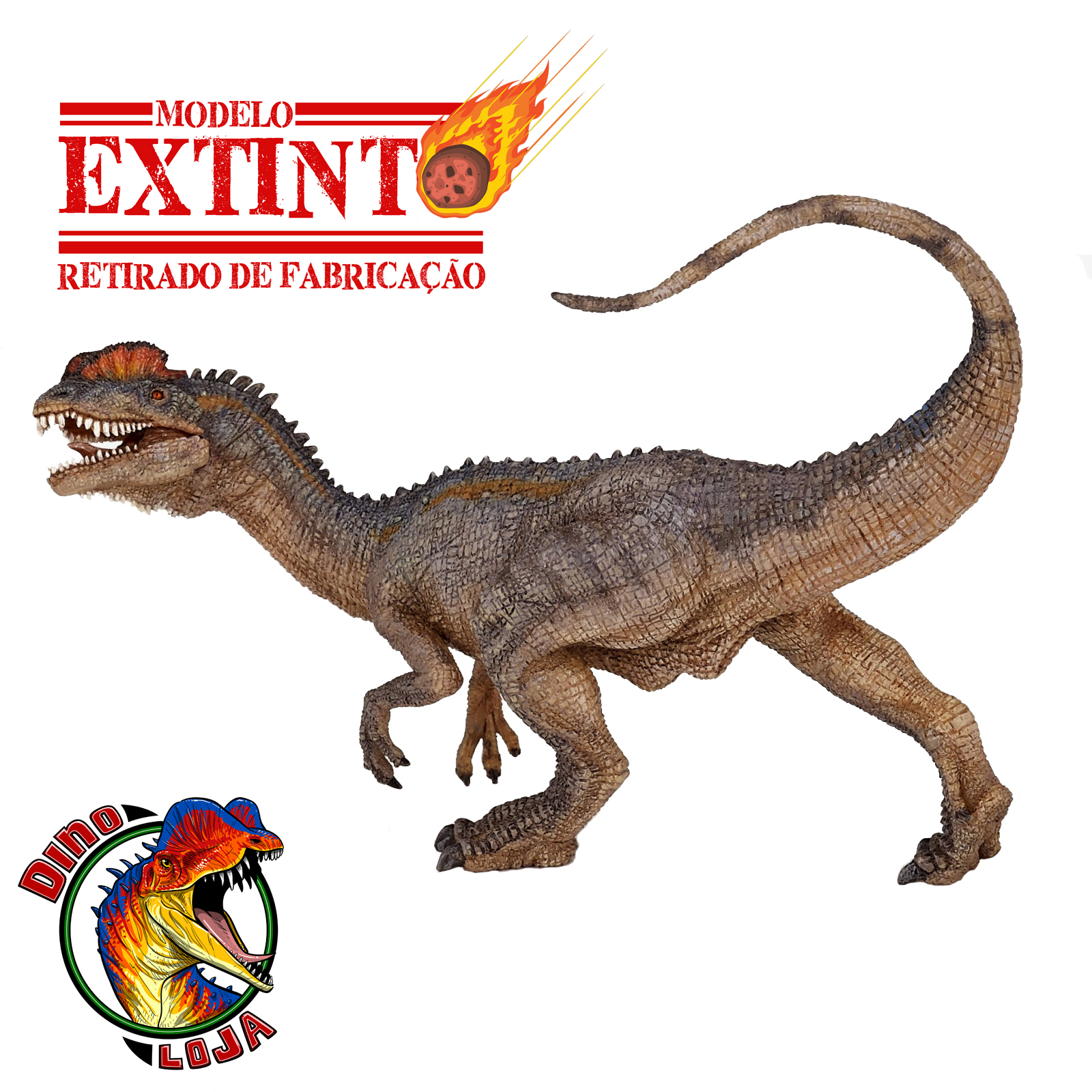 Sobre a miniatura: Uma réplica perfeita do dinossauro terópode Dilofossauro. Apesar do Dilophosaurus ser um dinossauro bem famoso, não existem muitas réplicas realmente boas dele no mundo dos bonecos de dinossauros . O Dilofossauro Papo é uma exceção, é um dinossauro de brinquedo extremamente detalhado, boneco de dinossauro pintado à mão que apresenta mandíbula móvel, podendo abrir e fechar a boca! Parece vivo, fiel à anatomia do animal real, além de muito detalhada apresenta pose dinâmica. É uma miniatura de dinossauro feita de PVC de alta qualidade e pintada à mão para maior realismo. Fabricada pela empresa Papo, da França, este modelo é lançamento do ano de 2014.