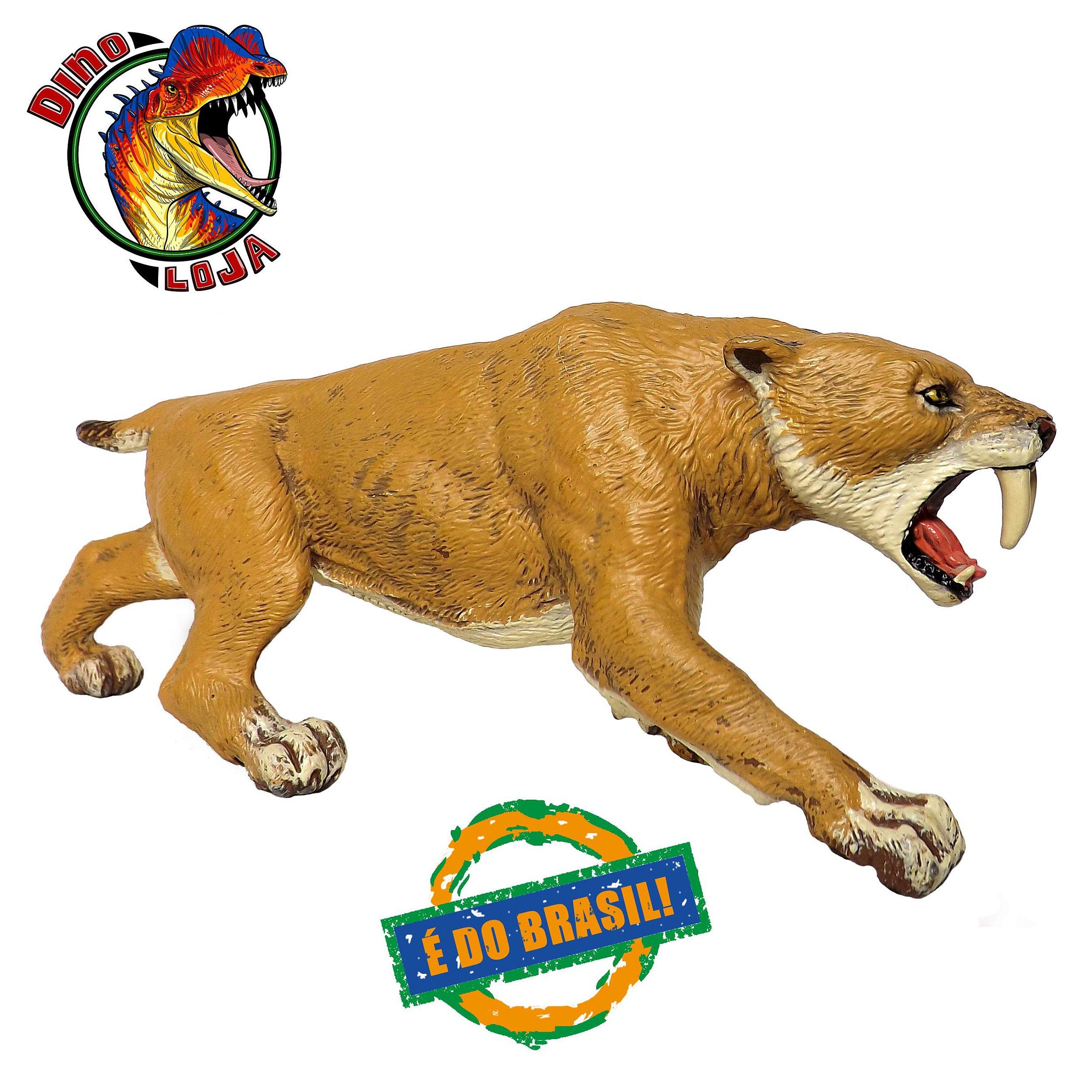 Sobre a espécie: o famoso Tigre-dentes-de-sabre ou Smilodon, foi um felino exinto magnífico com presas de quase 20 centímetros que viveu na Era do Gelo! Existiram três espécies, duas que habitaram a América do Norte, Smilodon gracilis e Smilodon fatalis, e uma, a maior de todas, Smilodon populator, que viveu na América do Sul, inclusive aqui no Brasil. Embora o nome sugira, ele não era um tigre verdadeiro, mas não era menos impressionante por isso. Este felino era adaptado a caçar com emboscadas e uso da força, não tanto da velocidade. Por isso era bastante robusto e devia usar seu porte de 3 metros de comprimento e seu peso para derrubar presas como bisões e outros animais, os quais então abatia usando as presas de sabre, que lhe dão seu nome.