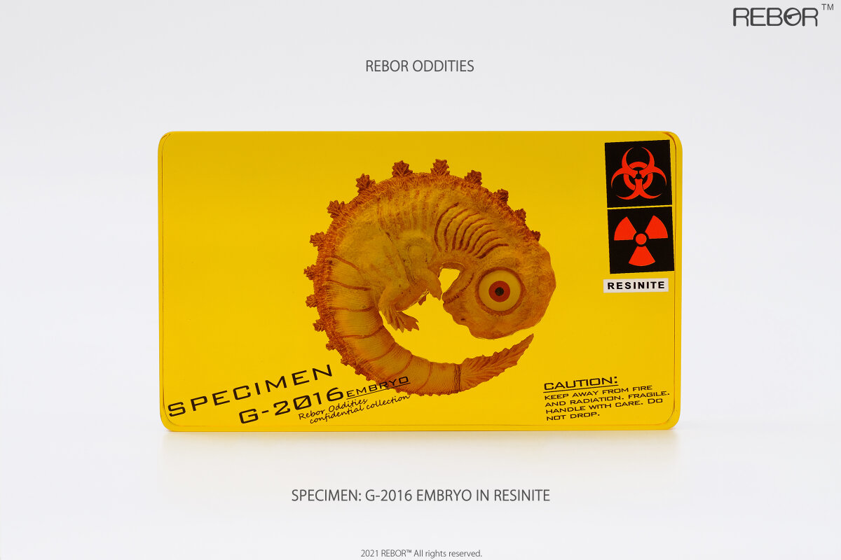 Sobre a miniatura: A empresa Rebor lança esse que é um curioso item de colecionador para fãs de Godzilla e outros kaijus, os monstros gigantes ficcionais da cultura pop japonesa. Essa réplica representa o que seria um embrião do Godzilla preservado e uma resina transparente chamada resinita, com cor amarelo ouro. A pintura imita a cor de um pequeno feto ainda não completamente desenvolvido, com tons avermelhados. Há avisos de risco radioativo no bloco de resina além de informações sobre o espécime contido dentro. Excelente item de coleção ou como decoração, peso de papel entre outras possibilidades.