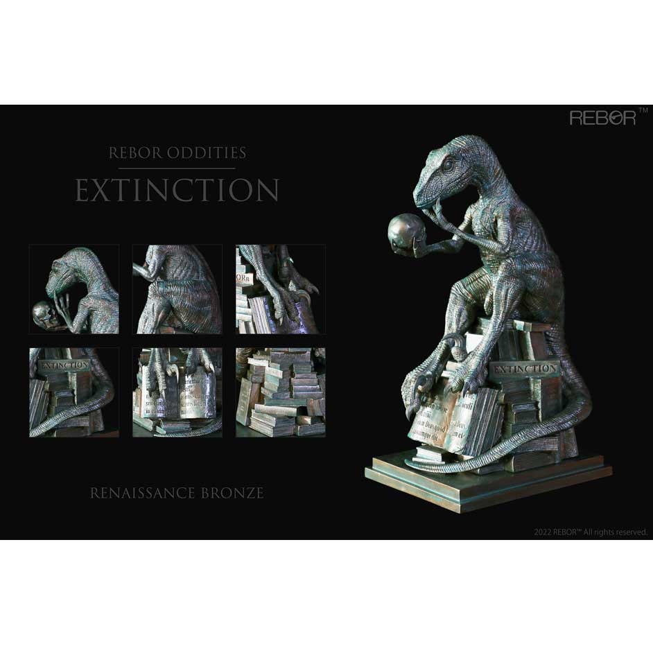 Sobre a miniatura: A empresa Rebor lança a estatueta "Extinção", um item da coleção Rebor Oddities (Curiosidades Rebor) que traz um Velociraptor estilo Jurassic Park em pose antropomorfizada, sentado sobre uma pilha de livros segurando um crânio humano na mão direita enquanto pondera sobre a extinção. Esse é uma verdadeira representação do clássico meme da internet, o Filosoraptor. O acabamento da peça imita uma estátua de Bronze do período renascentista. Produto é produzido em resina flexível e polystone. Edição limitada.