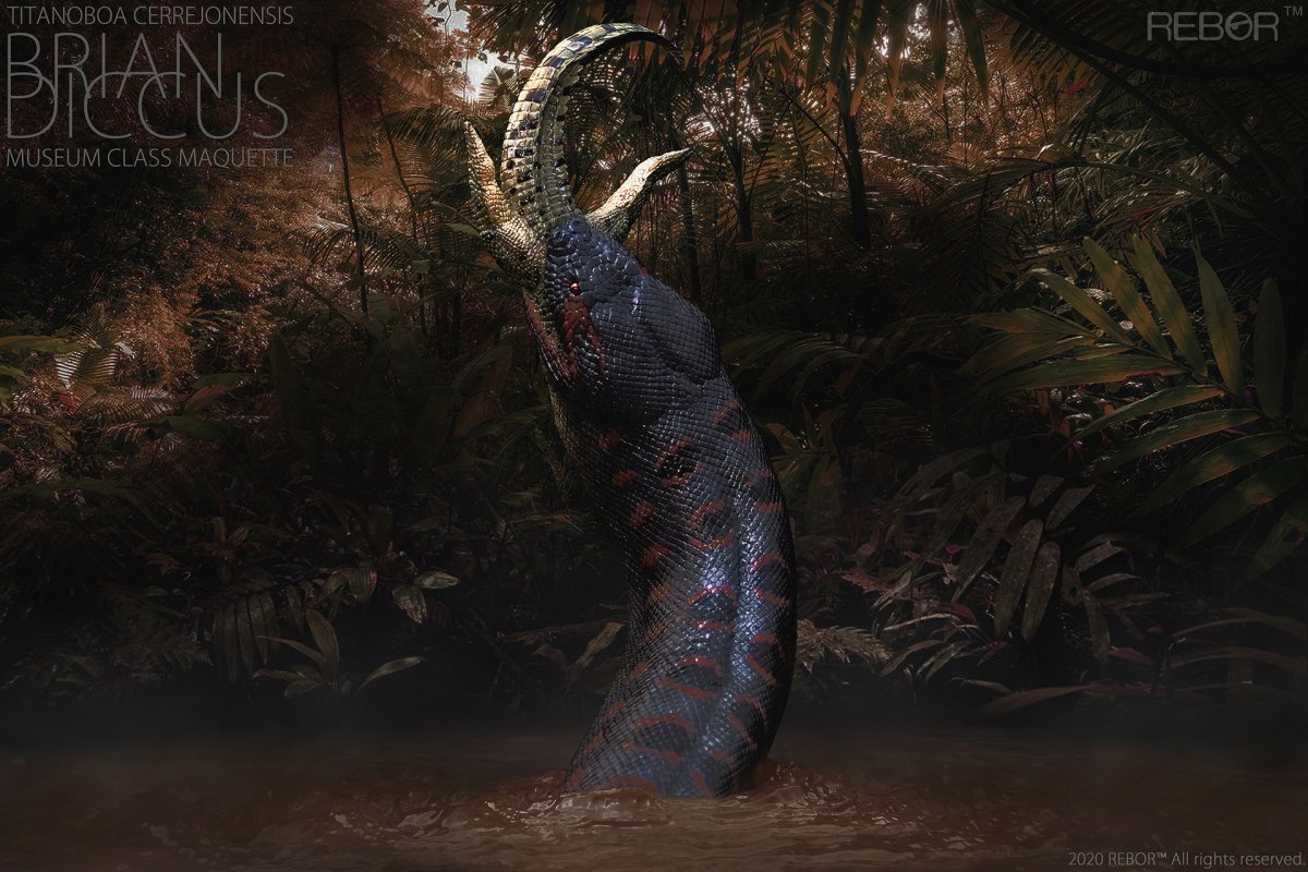 Sobre a espécie: A Titanoboa cerrejonensis foi uma espécie de serpente gigante que habitou a região da Colômbia durante o período Paleoceno, há mais de 50 milhões de anos. Essa enorme serpente parente da Sucuri era um animal enorme, com mais de 13 metros de comprimento e estimada em mais de 1 tonelada de peso. A maior serpente de que se tem notícia na história. Essa serpente vivia alimentando-se de grandes répteis como jacarés que habitavam a mesma região e mamíferos desavisados, sendo uma predadora de topo da sua cadeia alimentar.