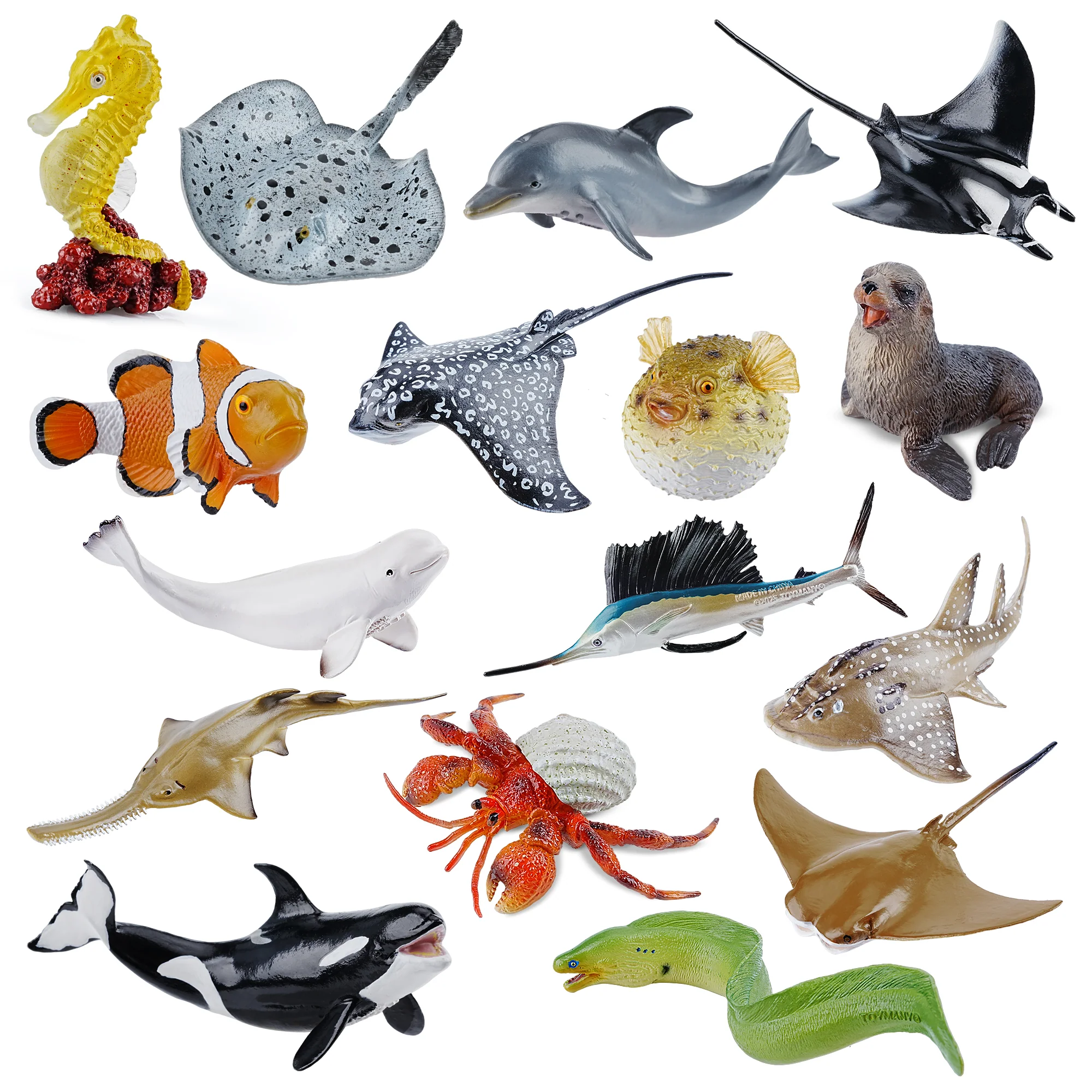 Sobre a espécie: O kit de animais marinhos inclui ao todo 16 modelos de espécies de animais diversos da fauna oceanica, incluindo mamíferos, peixes e invertebrados. As espécies são: caranguejo-ermitão, filhote de Orca, Lobo-Marinho, (Foca-de-Pelo), Baiacu, Cavalo-Marinho, Arraia-Manta, Peixe Serra Filhote, Golfinho Filhote, Baleia-Beluga Filhote, Arraia-Águia-Pintada, Peixe-Palhaço, Arraia-de-cauda-de-fita-redonda, Moréia-Verde, Raia-Nariz-de-Vaca, Peixe-Vela e Raia-Viola-de-Espinhos.